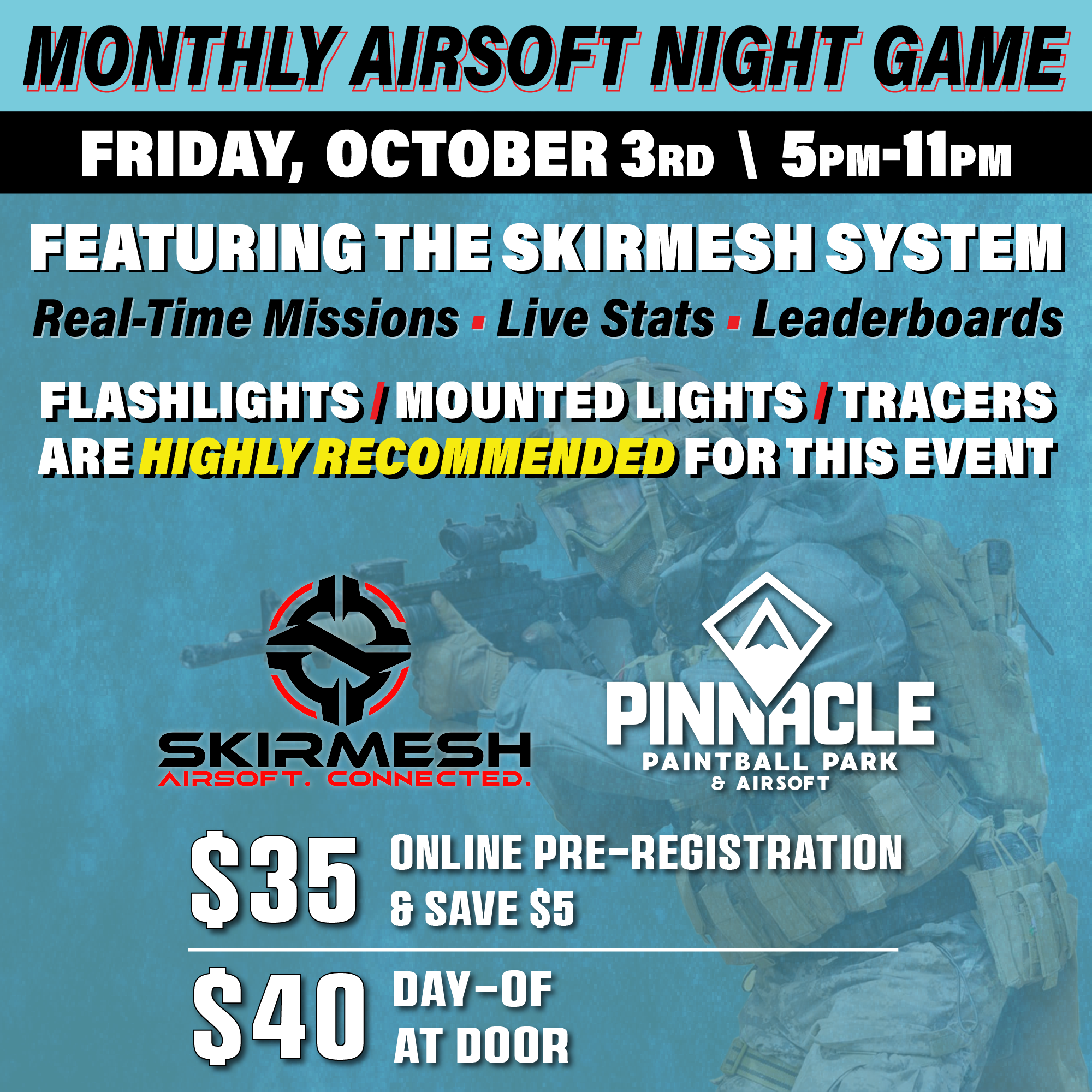 TICKET: Pinnacle Monthly Airsoft Night Game - October 3rd 5-11pm